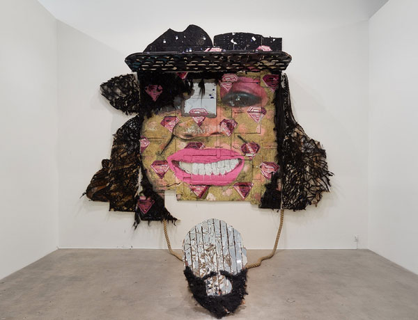 This art lets us move between and into dimensions. Stepping close, we see surfaces that are staggeringly beautiful both because they’re composed out of the universe of society’s familiar discards—broken furniture, water bottles, trash bags—and because of Fowler’s skill as a painter. He can compose with detritus as well as with oil and acrylic. Stepping back, distanced from the details, we take in the big themes: communal gatherings, as in Black Flag; epic arrivals, in Real N::::: (2015) and Landing (2015); and people Fowler holds dear, Jelly’s Little Girl (2015) and Mom Knows (2016). We move into the specificities of Fowler’s myriad references and back out to the key issues: who belongs, what’s real, who dies, who survives and thrives. Concept and material are joined to echo lived experience: we move between daily stuff and the long, hard process of transforming what is.