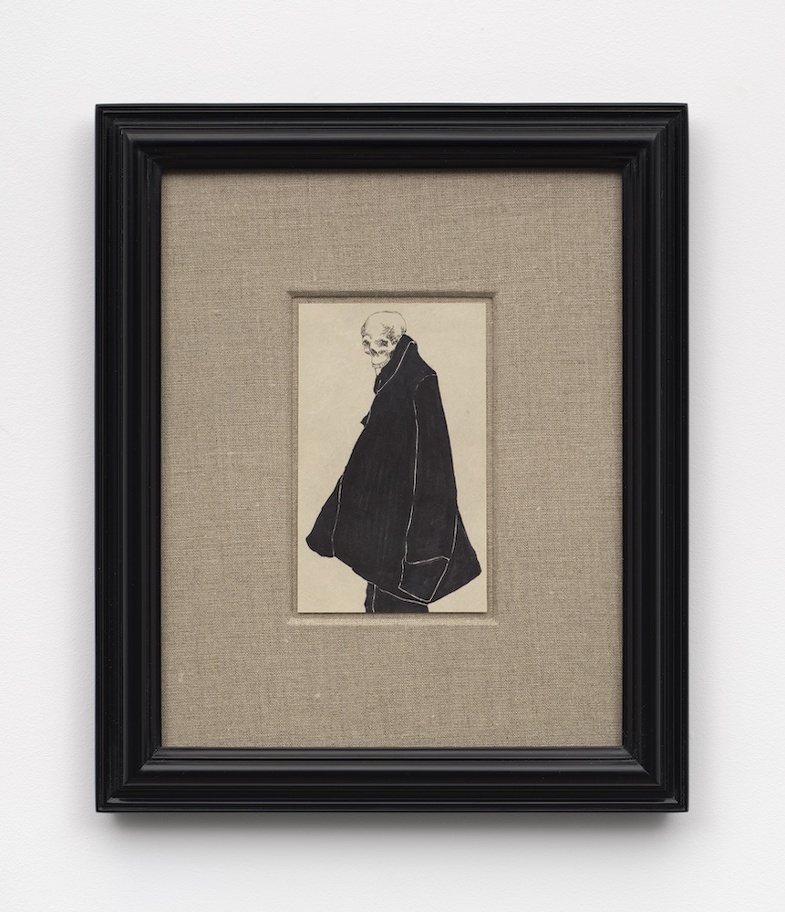 There is also some newly emergent reflexivity baked into this cast, in Painter, a pallid artist in a black cloak and hat gazes at the viewer, tilting his palette as if to display a stigmatic proof that the works were indeed conjured by the human mind, and thus implicating all who view them. The unfinished face in Contemplation similarly reveals its own connection to that which is human-reared, as do the heavily matte black areas throughout the show that stand in for the figures’ clothing. The viewer is confronted not with a jump scare, as in some of Alessi’s previous paintings, but with the slow burn of the unresolved. There’s even a memento mori moment in Dear Friend, where a skull in a cloak turns its head out to whatever’s behind it.