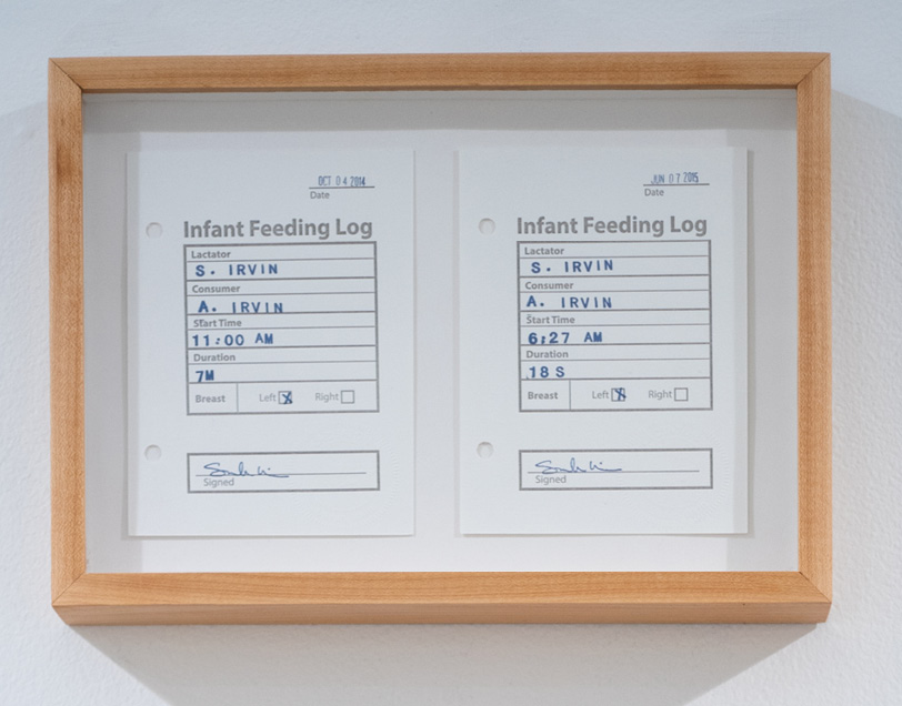 Infant Feeding Log (2018), a multimedia sculptural installation by Irvin consists of a rather intimidating catalogue. Recorded on individual index cards, the installation elaborates the specifics and lengths of time for which the artist breastfed her daughter. Complementing her feeding log, a portfolio of codified sketches of ink on paper, Breastfeeding Series (2014), is accompanied by a pair of sketches and catalogue cards framed together. Together, these works capture and illuminate, or at least memorialize, intimate moments of life, which are often lost in the passing of time. In focusing our attention on not just the ephemera, but the actual relations of the individuals involved, she calls attention to the significance of these seemingly simple actions.