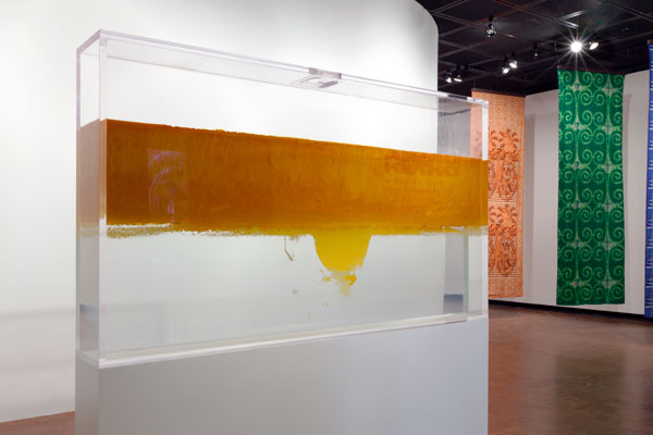 Significantly, some artists contend that Afro-Brazilian bodies are still subject to abuses and policing not unlike slavery. Rommulo Vieira Conceicão’s sculpture evokes a barricade or fences around a prison or housing project, and Tiago Sant’ana’s video mourns murdered youth in the Cabula neighborhood. Fittingly, as the exhibition is arranged in a half circle the last piece the viewer sees was also the first: Heráclito’s Divisor (2017), a large glass vitrine filled with salt water and blood-red palm oil, the latter thickly and sinuously resting on top of the water. The simultaneous melding and separation of the two elements is an evocation of the Middle Passage and a metaphor for the Afro-Brazilian experience.
