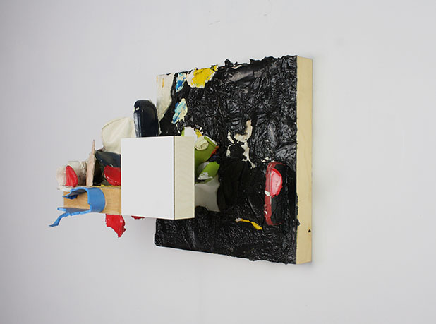 Mercier delights as an artist in the forms and materials of construction. Many of his pieces, notably the most sculptural, seem not so much composed as decomposed, ripped from the guts of some industrial space or funky attic corner, their studs and lathe marks not only evident but crucial to the overall (visual) structure, remnants of roofs and staircases imprinted on the ensembles. Some works — all are wall-hung (certainly in this exhibition) — are more overtly referential than others, and a few, while still dependent on latex, enamel, bolts, and other building elements, abstract themselves enough to suggest more Rauschenberg than tract house. (Indeed, the late artist’s Combines clearly give Mercier license and provide inspiration, as do other modernist art-architecture fusions such as Kurt Schwitters’ Merzbau.)