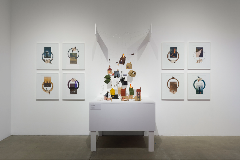 Tim Durfee and Doris Sung blur the boundaries between architecture and sculpture. Sung’s exquisite Fuller is made from thermobimetal, aluminum and steel. As viewers enter the gallery space they are immediately drawn to this nine-foot sphere with interlocking metallic and blue shapes and from there are equally seduced by Tim Durfee’s Capitol, a floor to ceiling sculpture made from wood, paint and plastic. Also included in the exhibition are documentary style photographs by Dave Hullfish Bailey, landscape photographs and graphite rubbings of messages made by 19th century settlers found along the Oregon Trail by Julie Shafer, a charged video installation about today’s political climate and pop culture by Michele O’Marah, as well as Guillermo Bert’s enigmatic digital projections on tumbleweeds.