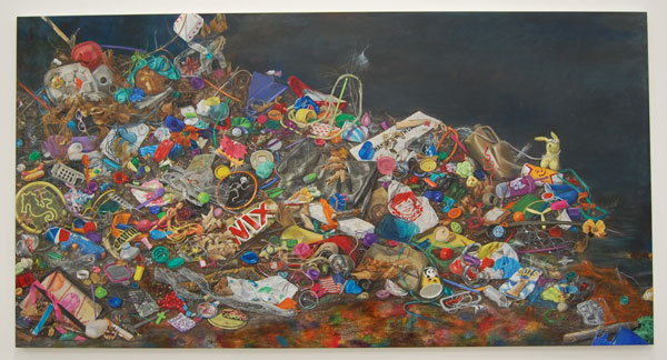 Generally, rubbish is quickly dispatched and secreted from public consciousness—or at least ignored. Constance Mallinson, however, revels in discards’ improbable pulchritude while questioning society’s prodigious dispersion of throwaway images, ideas and sundries. In dizzying detail, her paintings delineate fanciful wastelands populated by heaps of gaudy refuse. Evoking dumping grounds and landfills, these spilth-scapes illuminate undersides of our fickly consumptive world engorged by glossy disposables.
