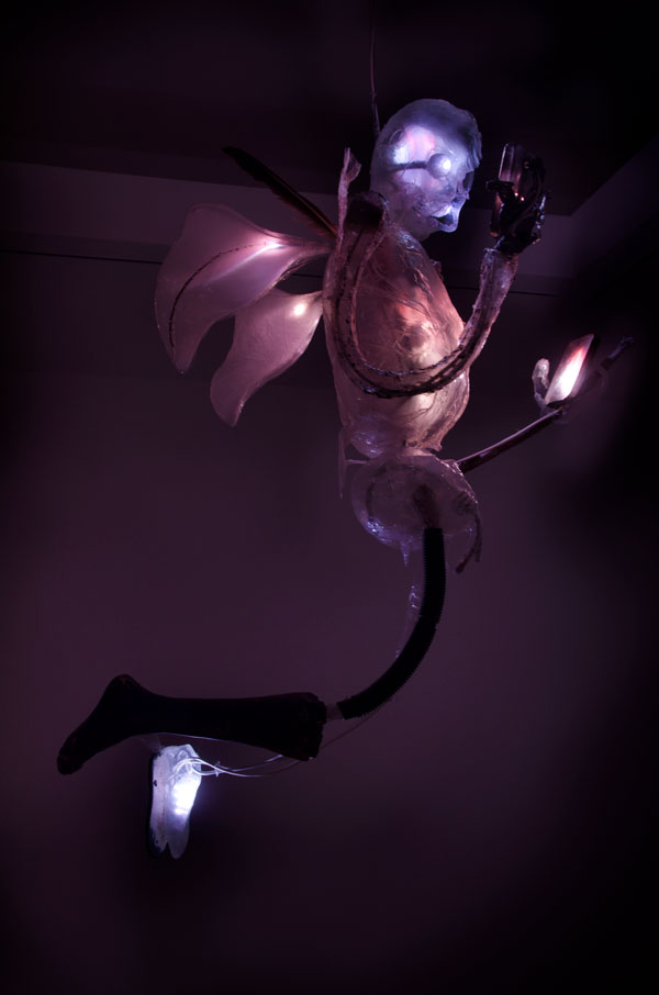 These plastic and metal figures are also stuck with found objects and beach driftwood that reference the natural world of yesteryear. Cloud Nine depicts bodies as non-medium specific, in a Rauschenberg combine-like twist on the human body. The Angel possesses wings and floats by wires, displaying a satirical levitation. Another figure appears to either levitate or hang from the ceiling by a noose. It looks like a celestial ghost liberated by technology that grants an eternal stream of information.