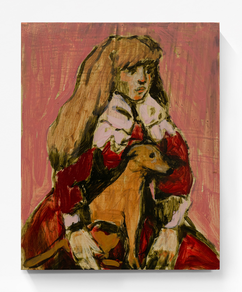 Compare, for example, Dead tired from the burden of a dream (2025) and You’re on the other side of that mirror (2025). The former depicts a young girl, scowling and contorted, staring at the viewer against a pink sky and a yellow moon. This painting feels complete, tied up with a pretty ribbon, but there’s nothing about it that needs to be accounted for. You’re on the other side of that mirror seems to depict the same girl, this time sitting happily with her dog. While the mood is more cheerful, small details, like the dog’s haunch which is nothing more than a few daubs of paint, breaking with its more considered head and upper body, or the wedge of hair sitting over the girl’s shoulder which seems impossibly thick and heavy, create a chasm in the sweetness, like the tart pop of blueberry in the pancakes I was about to eat.