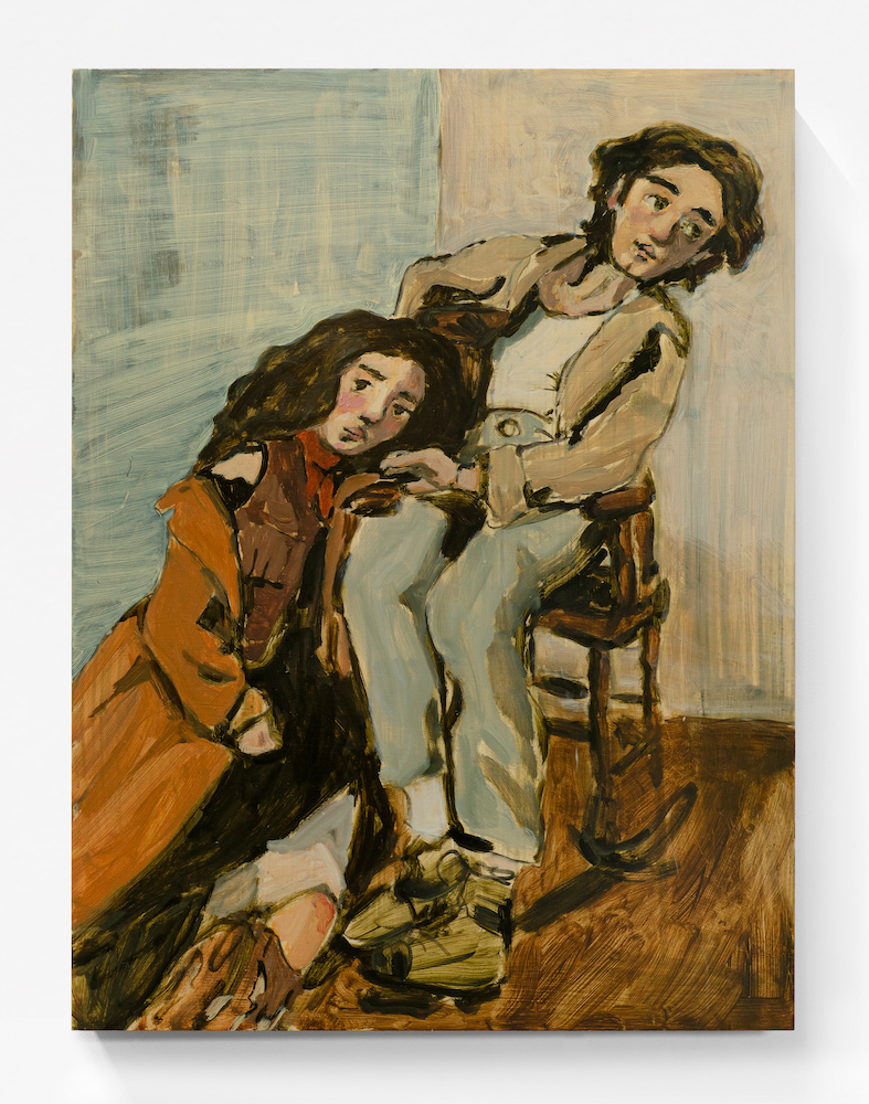 The world-building possibilities of dolls, the projections they dutifully absorb, the romantic and clandestine lives we hope they’re living when we tuck Barbie and Ken in the sock drawer together, seem to be at the core of Tchiprout’s paintings. The subjects of these works, according to the press release, are painted from the artist’s own handmade dolls, which she stages in her London studio. Looking at them, I was reminded of a book my parents gave me as a child called Secrets from the Dollhouse, about a defiant young doll named Emma who dreams of going on adventures under the infinite night sky, only to find that she’s happiest at home with her little wooden family. As a young girl, I saw myself in Emma, her dogged independence, the small adventures she steals for herself, and her unremarkable short brown hair. Here, Tchiprout depicts her own dollish projections, weaving them together with themes from Yiddish fiction and poetry (the title of the show comes from a poem by 20th-century poet Anna Margolin), endowing her quasi self-portraits with the mythical quality of a story passed down visually, but never recorded on paper.