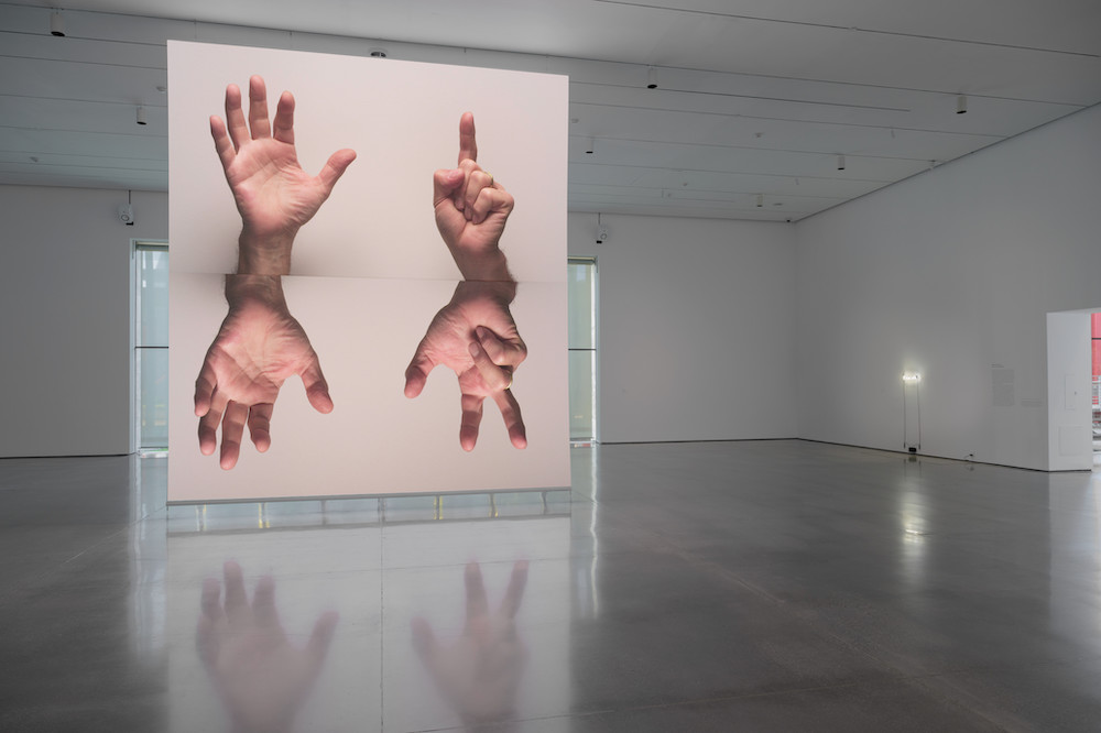 At LACMA, Bruce Nauman’s For Beginners (all the combinations of the thumb and finger) (2010) is a large-scale video of two pairs of hands, palms out, holding up—you guessed it— different combinations of their fingers and thumbs. In two separate, simultaneous recordings, Nauman’s voice overwhelms the cavernous gallery with instructions for the left and right hands: “third Finger, second finger, thumb,” and so on, flatly droning on at a steady pace, each recording cacophonously talking over the other. The stark simplicity is not particularly pleasant to behold, but it is strangely hypnotic. Being conceptual art of the highest order—the kind that ordinary people dismiss as pretentious nonsense—For Beginners prompts an immediate question: “Why?”
