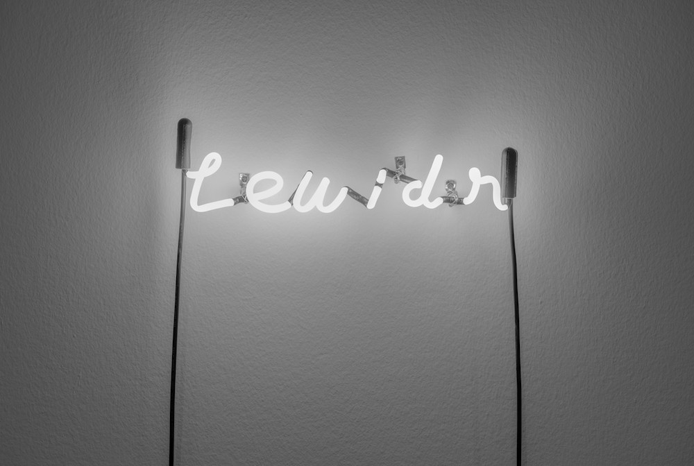 Accompanying For Beginners (all the combinations of the thumb and finger) in its room in the LACMA is a neon Nauman from 1972. It is called, and says, Lewidr in cursive text. The interpreting mind goes to work, scrabbling at this nonword—it’s an anagram of “wilder”. It’s wilder than no known object. Turns out “Wilder” is the name of Nauman’s first art dealer. Tee-hee.
