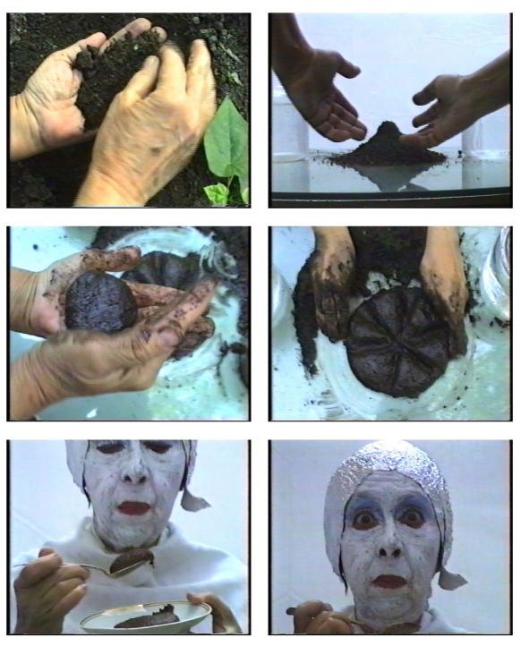 Earthcake (1992), better than any Bruce Nauman video, features the artist, in Kabuki makeup, as she constructs and eats a mud pie. Another black-and-white video whose title translates as “The Hands. For the eye, the hand of my body reconstitutes my portrait” (1977) is a montage of short clips of the artist’s hands moving objects, drawing and smoking. It is shot from the POV of a head-mounted camera likely illustrated in one self-portrait from the photo series Alterity (2002–11)—a thoroughly absurd headgear with antennae of foam, something you’d expect from Mike Kelley. But the sensibility is pure Ionesco, also Romanian by birth: to wit, she’s dressed him up, that existential father figure, by painting a clown nose on a photograph of him (Ionesco—The Clown, 1971).