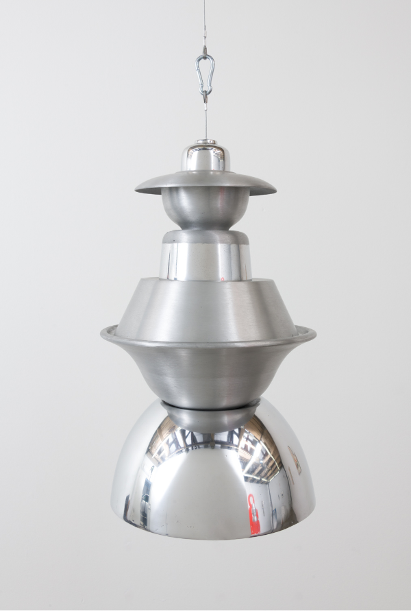 Charting in another way the convergence of the everyday onto a broader historical plane, Nick Kramer’s mixed-media works in “No Neighbors, Street Lights Are Out” follows an equally winding path through the impressions that the world immediately around him places in the artist’s eyes. A series of works all titled Weather Balloons (2018) appear at first glance to be the somewhat dulled bodies of shrunken satellites or enlarged spinning tops, but on closer inspection are seen to be the shapes of aluminum pots and pans collected, shorn of handles or signs of aging, and aggregated in vertical columns. Proposed as stand-ins for failed near-space exploration devices, they hang at various heights throughout the gallery. The nearby presence of photographs, all titled A Hand of Pots and Pans (2018), in which these aluminum rounded casings are portrayed with handles and stains intact, underscores the somewhat dystopian neighborhood that the artist is exploring internally and externally. Even in the lightness of the polychrome aluminum work, such as Green Moon (2018), with its light green and pink hues coursing below an orange route indicator, an ineluctable melancholy pervades the work.
