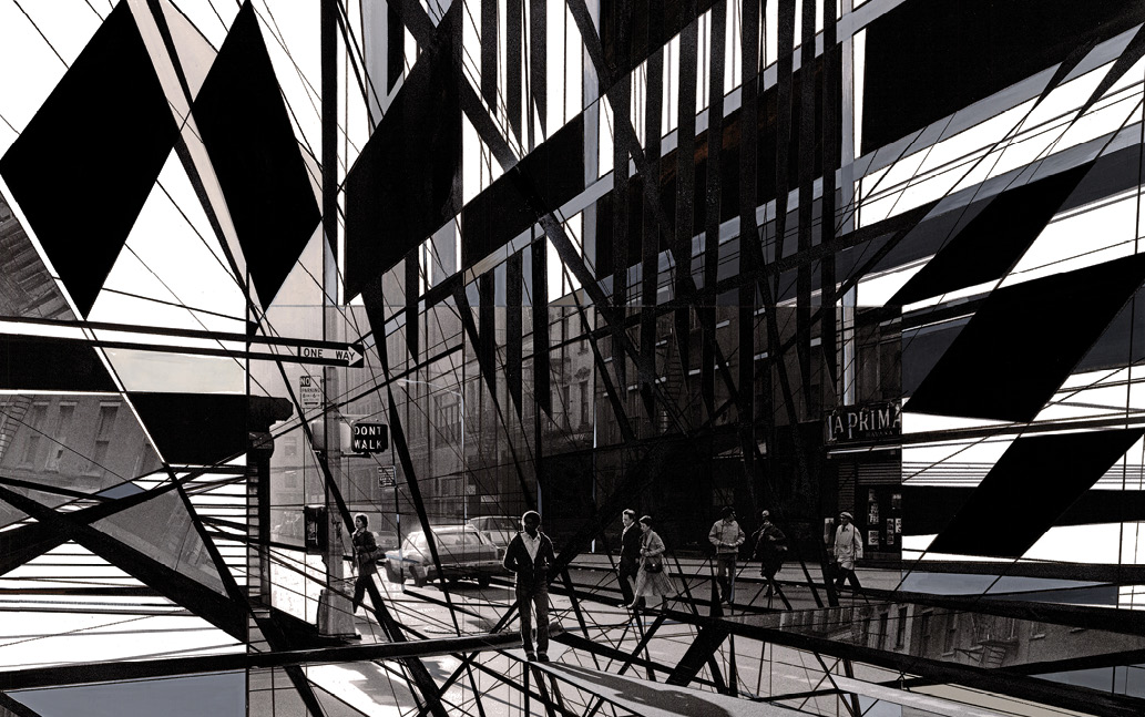 The first stratum of Rousseau’s compositions consists of photographs that the artist overlays with drawing, in which the mark making sometimes follows the underlying image while at other times deviating from it entirely. Or, in a variation, photographs are cut up and then collaged together to create multiple layers. In Daydream (undated), for example, a smaller head of a woman outside a window is looking off into the distance. Her eyes are closed in a dreamy way. In the foreground, buried in a chiaroscuro swirl of grays, blacks and whites, there is a partial portrait of a man and a small dog. Likewise, in Reverie (undated) the image of a man—photographed from behind, looking out of the window onto a street scene—is surmounted by swirls and graceful ribbon-like forms that animate the entire surface. Uncovering a path away from the figurative reality of a photograph, the viewer is taken to a place where the intersections are not literal, but imaginative. Rousseau’s work alludes to a life of the spirit that moves beyond the merely visible.