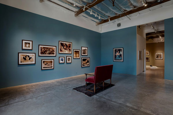 Conceivably at the time it was made, the work addressed notions of cultural narrative and cultural/social identity, and the oppressiveness of historically predetermined norms and institutionalized ignorance. Today the conversation seems much broader and more fundamental—and the gallery’s installation reinforces this sense. The first gallery is styled as a kind of drawing room, the photographs hung in a gracefully uncluttered salon-style grouping. Selected portraits are set off by themselves, as if they were family and ancestral portraits. Half of these are against walls painted French blue, the others against a faux wallpaper-style mural-map of historic and cultural landmarks of the Conejos River/Rio Grande/Four Corners basin that extends across the Southwest—a region where Meso-American and North American indigenous peoples once crossed and commingled and variously repelled, endured or were nearly exterminated by invading European armies, only to contend finally with the Anglo-American dominant forces of the United States government, whose rapacious appetite for the land’s resources can never be satiated.