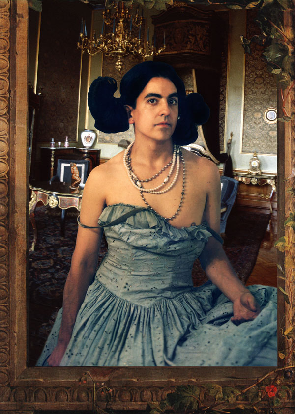 Gonzales-Day both acknowledges that suppression and carries it forward to the surface/present by inserting his own image, variously posed and costumed, into these settings, both staged and culled from historical artifacts and memorabilia. All the characters depicted are embodied by the artist himself, from the progenitor “bone-grass boy”—a bather along the lines of a proto-symbolist Cezanne or Picasso (Untitled, #13, 1994), to his brother, sister or lover (Untitled, #28 and #14, both 1996), to the face of the ancestral señorita from #36, to the portrait of an aristocratic doña who might never have left Spain (Untitled, #5, 1996).
