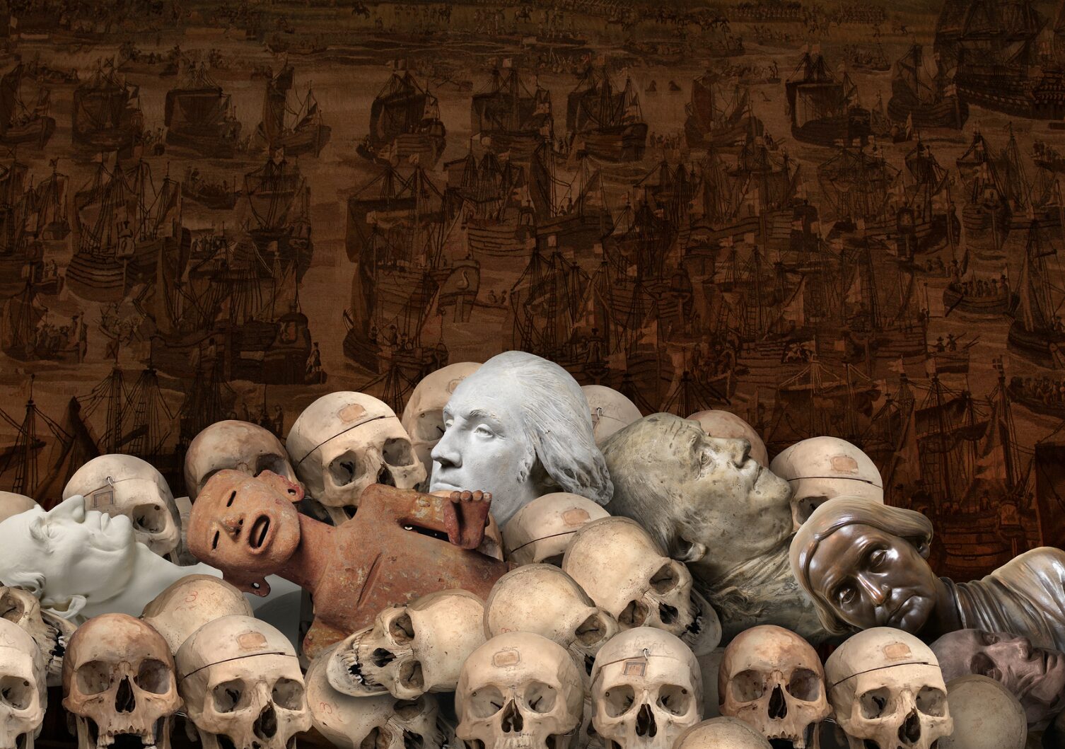 The centerpiece of the exhibition is Xipe Totec with Busts (2025), a large scale digital collage that features a tapestry background of Danish imperial ships and at the foreground are a number of decapitated heads including that of a Xipe Totec, the Mexica goddess of fertility, as well as the heads of slave-owners and eugenicists, once celebrated figures of the Western world, and human skulls sourced from the Museum of Criminal Anthropology. In this work Gonzales-Day imagines subjects of fallen empires all smashed together as detritus of a collapsed world.