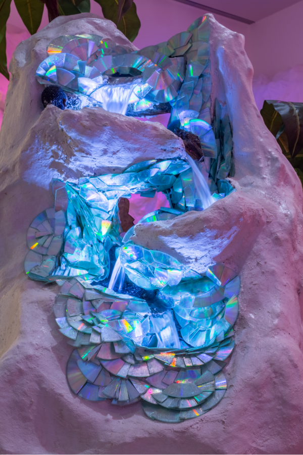 The aesthetics and content of we still here, there (2018), Lauren Halsey’s current installation at the Museum of Contemporary Art, Los Angeles, are deeply rooted in Afrofuturism—a cultural philosophy that merges magical realism, science fiction and technoculture to critique the present day and historical dilemmas of black people. Typically, Afrofuturistic work features depictions of African roots, specifically Egyptian, which Halsey does through her shrines of African leaders and African rugs that line the entire installation. Other details, such as the music playing in the background and the aforementioned voiceovers are direct odes to Afrofuturistic trailblazer, Sun Ra.