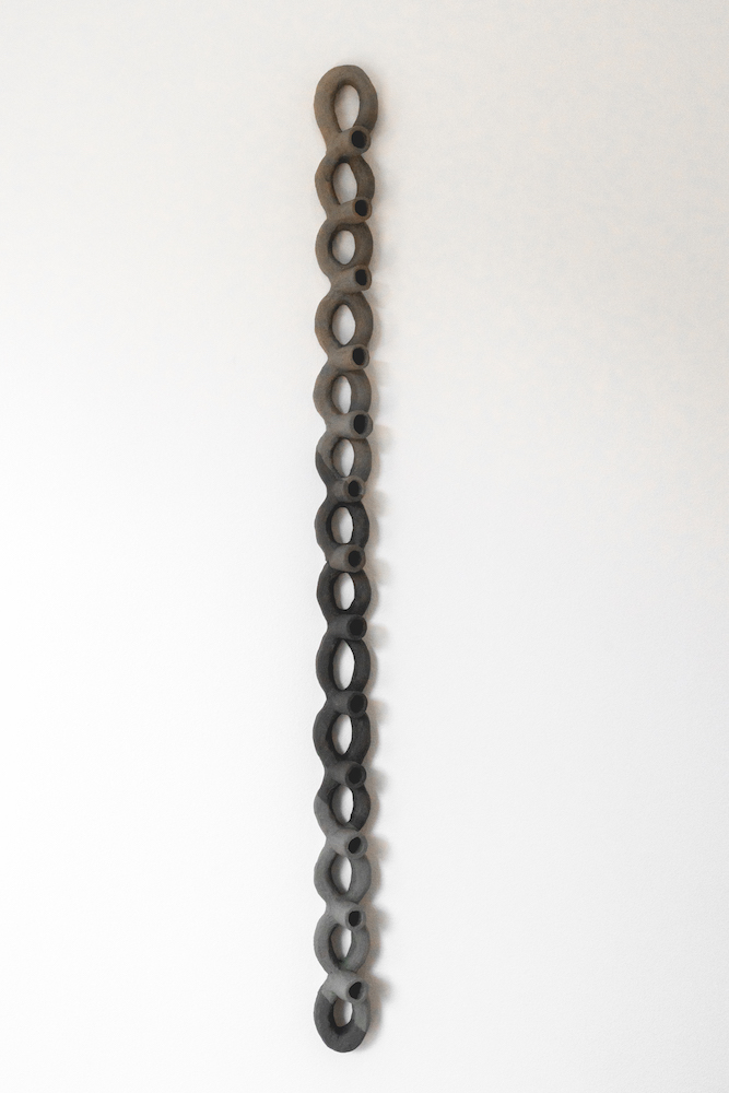 This is likewise true of Intake Manifold (2025), a concrete gray, braided ceramic sculpture creeping like ivy down the gallery’s back wall. At each knot, one of the strands points out perpendicularly towards the viewer, revealing itself to be a hollow tube reminiscent of a candle stick or an exhaust pipe. Here too, the work appears to be both machine and living organism.
