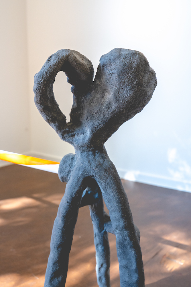 Compressor (2025) stands out from the other sculptures in the show for its mass. At eighteen inches tall, the work stands only slightly above the Sentinels’ perky ears but because it is a grey rectangular slab, the work appears more imposing. A round hole is drilled through the sculpture’s upper left corner. A ridged wheel, like the edge of a quarter or the spark wheel on a lighter protrudes from the side.  The sculpture looks somewhat like a lighter or a smartphone but the nature of working with clay limits this comparison. Unlike the smooth surfaces of plastic or glass, Compressor’s rough texture is evidence that it was made by hand.