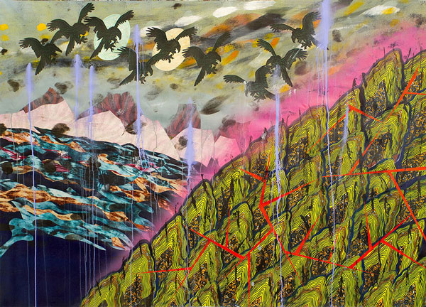 Estes’ Cassandra-like voice does sound its warnings in the titles—including an oceanic piece actually called Cautionary Tale (2015). Landscape-derived and somehow both ironic and literal, the titles are like clouds forming across the proverbial sunniness of the images, which prompts the viewer to render attention to details of disruption, fetidness, entropy, litter and death that punctuate the prismatic sweeps. Black Star (2016) is a bright constellation of golden Impressionist batik. Full of fissures and cracks in its firmament, it is glorious and mournful, fractal and vertiginous. Radioactive Sea (2017) and Desolation Row (2013) highlight a primitivist aspect in her rendered figures that goes to a slightly ancient, pagan place. Chemical Falls (2016) and High Noon (2016) demonstrate Asian and Indian influences not only in their verticality but in the scroll-like waterfall centrality of their motifs. Among the most literal in pictorial terms are the charming Melancholia (2012) with its folksy Hudson River School triangles of cultivated hillsides, and the explosive Yellow River (2015) with the solid glitter snaking through the earth below a fiery lava sky.