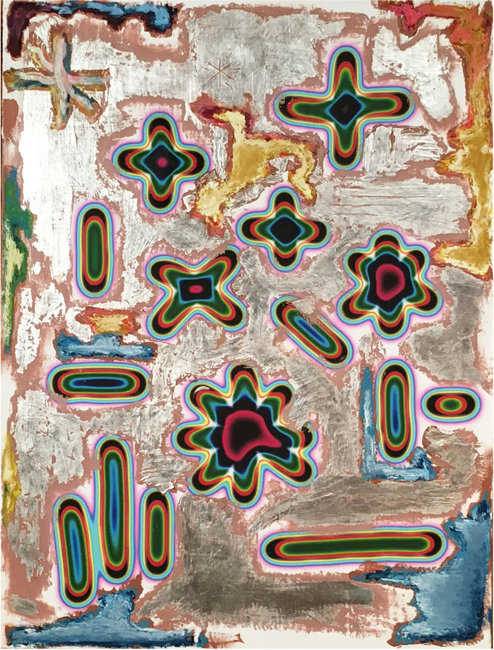 In the mixed-media works of his exhibition “Neo-American Transcendental,” Michael Maxwell employs materials ranging from the prehistoric to the digital. Clay, natural mineral pigments, plant dyes, wheat paste, quartz crystal, silver and gold leaf, beeswax, encaustic, and oil and acrylic paint, are all applied on top of, or amongst, digitally-created scenes or patterns. Viewed as a maximalist’s take on primitive mark-making or a historically-minded Abstract Expressionism, Maxwell’s work deserves attention, but where his work truly stands out is in his handling of the digital. Like other artists who have successfully incorporated it into their work, Maxwell’s is not “about” the computer. Maxwell takes the computer—one of the biggest influences on contemporary art and painting—and folds it into something earthen and materially complex, brilliantly enhancing our sensitivity to it.