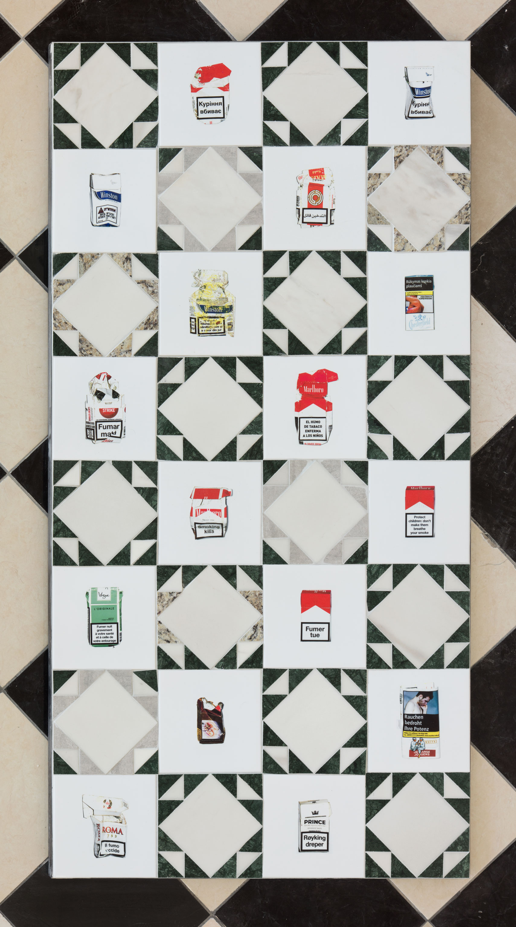 Toward the front of the gallery, Queenland situated seven 80 by 32 inch panels arranged to form an architectural shape that only partially covers the floor and calls attention to the contrasting scales and patterns. Adjacent to this cluster of sculptures are two more connected works—Untitled (Services #3) and Untitled (Foreign Tongue) (both 2017) that form a «T.» In Services #3, Queenland embeds sixteen tiles depicting the diverse coloration and typography of cards advertising services whereas in Foreign Tongue he juxtaposes and explores the details of flattened cigarette packages. Other panels contain an assortment of deflated and ripped balloons, as well as combinations of items organized by size, shape and function.