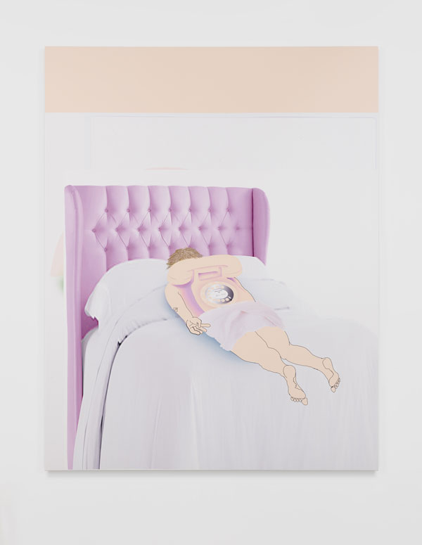 Williams’ inkjet paintings feel deliciously off-kilter, and the irreverence hits at varying levels, generating layers of ambiguity. Take, for example, JC (all inkjet paintings 2018)—a Christ crucified on a 45 mph road sign—and Descendant Egg, an egg fried sunny side up, band-aid stretched across the yolk as it appears to be slipping through cracks in lavender-colored flooring. With Middle Game 1 Williams uses a modified aspect-ratio photographic image of a bed. The lavender tones of its quilted headboard find echoes in the skin tones of the crudely drawn towel-draped figure that lies prone on the bed—and whose back morphs into an analog telephone. Mike, spatially organized around overlapping geometric fields (the subtle modulations of color between intersecting planes evoking Albers, but updated), is reminiscent of a joke where you meet yourself coming and going—only, Mike (a self-portrait?) is pissing into his own back pocket.