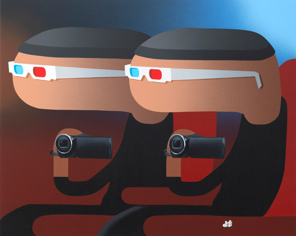The Germaphobe is a painting that features a kneeling, bulbous, hot dog shaped and colored figure attached to high-tech, steel-colored contraptions including a hand-dryer. The figure is trapped in a generic blue/green room from which there is no escape. The childlike innocence in many of Epp’s paintings is contrasted with an ironic humor and an attitude of condescension that verges on the pathetic. Choking Hazard presents suicide via an Apple charging cable. Security Threat warns of the dangers of sharing electronic information. In this painting, two figures wearing sunglasses are mirror images of each other. Together, they are positioned in front of a brick wall, holding a glowing neon green box with a pulsating white rectangular center.