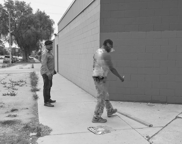A pair of African-American men engage in dialogue in The Boss (2015), another photo mural depicting a staged street scene in his studio neighborhood in South LA. The figure on the left, wearing a button-down plaid shirt, black wingtips and a cap, and sporting an earring, is directing the one on the right. Clad in a wife-beater style t-shirt, jeans, shades and tennis shoes, the second figure exhales a dense cloud of smoke. They stand on a desolate corner where dirt and weeds meet cement, a crushed Bud Light box and a piece of lumber lying on the ground. The right figure, actually a blurry Photoshop composite of two separate images, is largely transparent. Here Kydd’s work seems more clearly related to the everyday street scenes of Jeff Wall, for whom he worked as a studio assistant for four years.