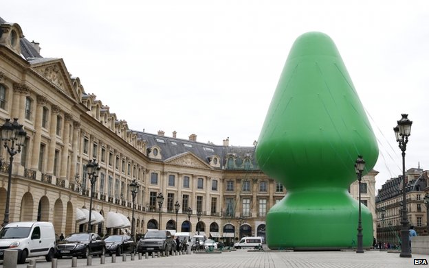 A huge, green, inflatable sculpture on a famous Paris square has raised a storm for its resemblance to a sex toy, with the artist attacked in the street.