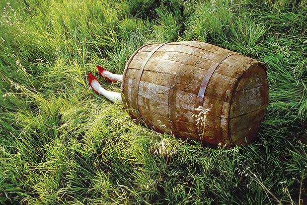 Sternbach gives us images born of the sea that are haunting and dream-like. A costumed merman and mermaid loll on wet, reflective sand in “Social Sharing;” surfers stride across the beach or pose by their longboards captured in warm sepia tones. Several shining boards, wedged in a small heap of sand bisect the exhibition. Working in large format film and using early photographic-era processes, Sternbach creates perfect images that have a pearl-like, antique glow.