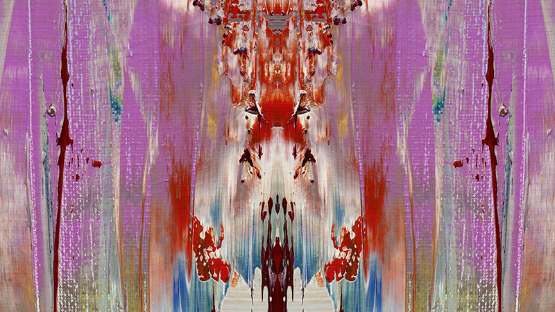 Yet they are unsettling. Rothko’s Chapel (completed after the artist’s suicide in 1970) comes to mind as an after-affect of the exhibition, when the Richter/Belz video of the second gallery has played out. Seemingly an apex to Richter’s production, it provides a way to conceptualize his life’s work in light of his advancing age but without his hand or presence. Multitudinous “color bars” bracket the Richter/Belz video, and as the painting’s abstract color imagery is woven and animated through cutting and layering, its mesmerizing, vibrational energy communicates spiritual yearning while Reich’s accompanying ode-to-joy memorializes Richter, as if postmortem. The climactic resolution of the video’s ornate patterning back into strata of color recalls a speed Paul Virilio might refer to as the logical perception of war, but also suggests the artist foreseeing his own endurance after death. We recall Belz’ interview when Richter reveals he never again saw his parents after leaving East Germany to become an artist, his past like a shadow in the many paintings and images he has destroyed on this path to envision a joyful, transcendent future—bringing his audience to awareness: this awaits us all.