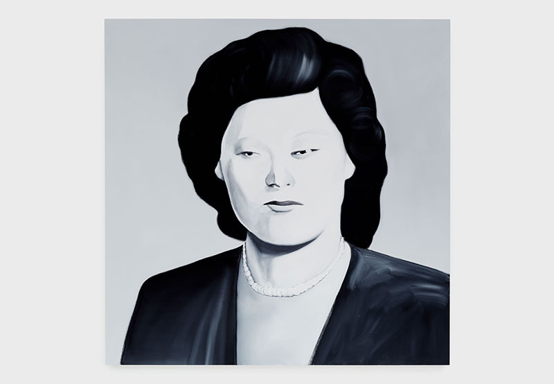 The first Tomoo Gokita painting to be seen, entering from the reception area of Blum & Poe, is a 76 3/8” square portrait in Gokita’s staple grayscale acrylic gouache: Daughter of a Fraudster (all works 2018). The Daughter has prepared for her portrait: her black hair has been curled away from her face, and she wears a string of pearls and an elegant blazer. But her face is poised between frown and sneer. Already she is certain she will be disappointed, either by her portraitist or, later, by the viewer.
