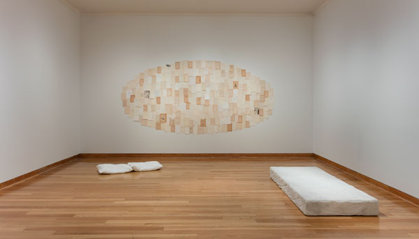 Soares’ work, Edit Series (2012), continues the artist’s meditation on love. Here, Soares has redacted her original print copy of Barthes’ essay and framed individual pages. Thus absorbed by Soares, Barthes’ essay becomes her poetry. The negative space in the redacted black lines of Edit Series are echoed in the hand-carved marble mattress and pillows that hold the cold hard empty prints of bodies in the After Series (2007–2012).