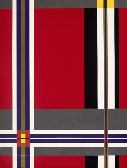 Her fascination is abstraction, but to call it simply geometric, minimalist or hard-edge would be misleading. Towers (2015), which might superficially approximate this description, reads as an array of red rectangles enclosed within borders of white, subdivided vertically by blue bands and horizontally by a triple “spandrel” of blue, bracketed within red borders. An implied “repeat” extends into the lower quadrant of the canvas. It reads on an abstracted, quasi-symbolic level as a fluted column fragment, but in more contemporary, even iconic terms, as a section of a high-rise tower, with its emphatic vertical thrust invoking those most iconic of towers. But shifting back to the more minimalist reading sets the viewer up for broader possibilities—rhythm, harmonics.