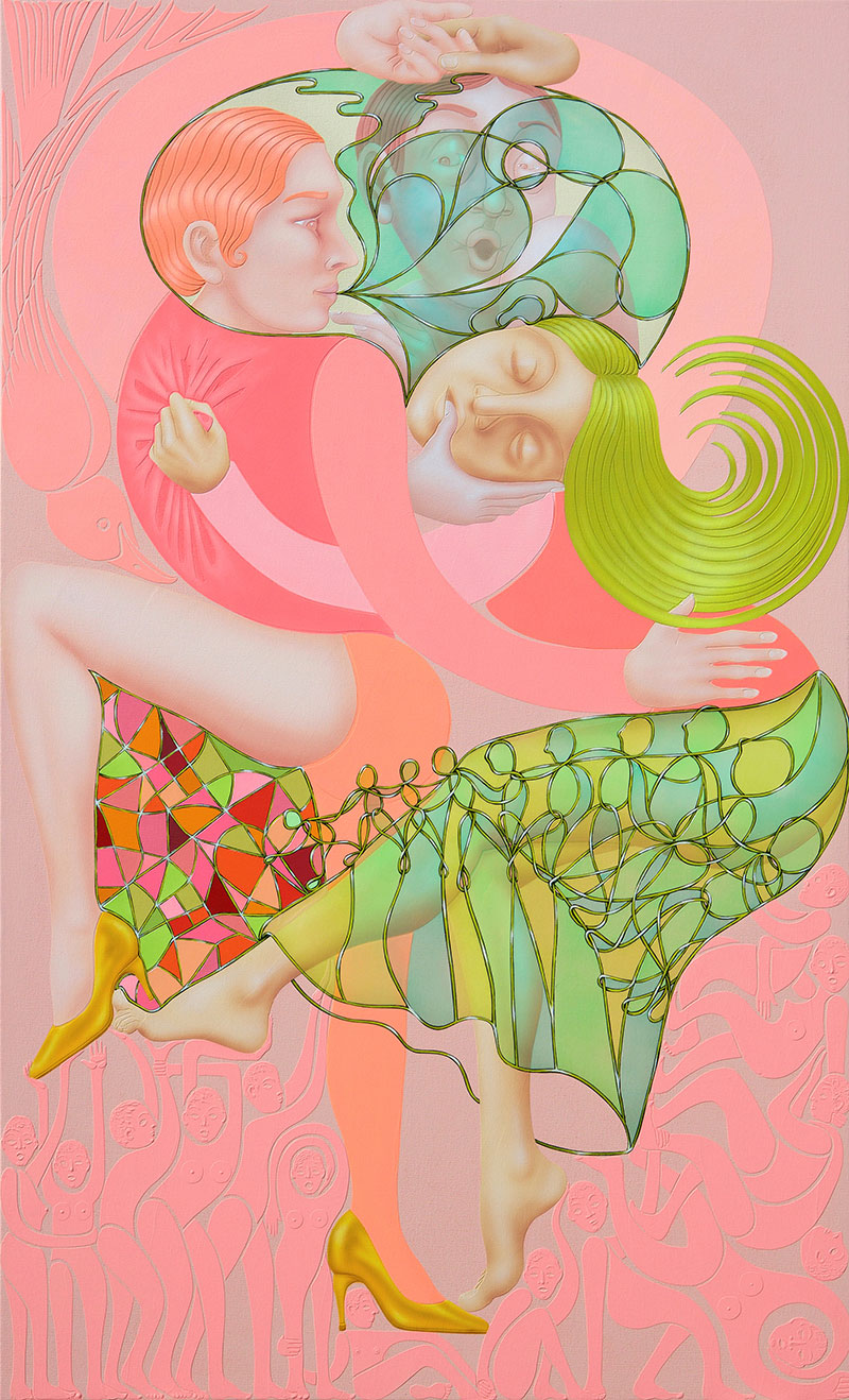 “Fever Pitch,” Wendell Gladstone’s new collection of paintings, achieves that elusive characteristic in which the longer you look, the more you see. It may be the bright, cotton candy-colored palette that draws you in, but it’s the details that keep you looking. At the heart of “Fever Pitch” is the movement and dance of lovers. Bodies intertwine and embrace, clinging to each other in the throes of passion—though many of the women in the paintings seem to be losing themselves in euphoria more than the men. It leads me to question, are these works exploring the female orgasm?