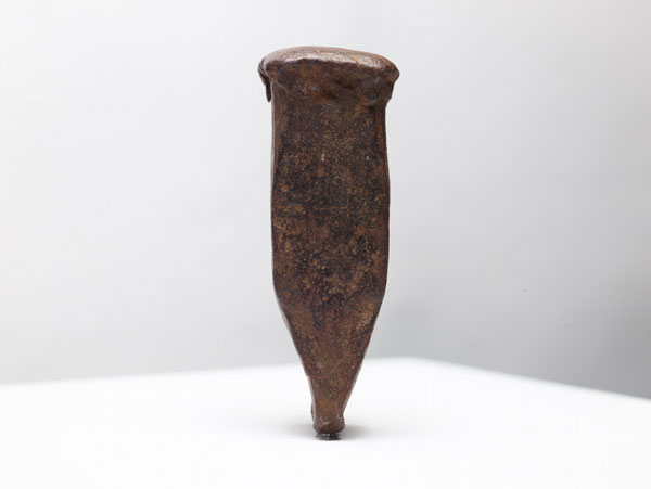 Six pedestals form regular rows dividing the gallery, each around chest height. Each bears a single metal object, a tool, or head of a tool, brunt (i-vi), encased in a thick coat of rust. The “sharp” edges, each poised on the top of the pedestal, actually appear blunt, having been eroded by time and use. Perhaps they symbolize the human workers who also bore the brunt of their labor; as one considers these objects as stones and monuments, a somber air arises.
